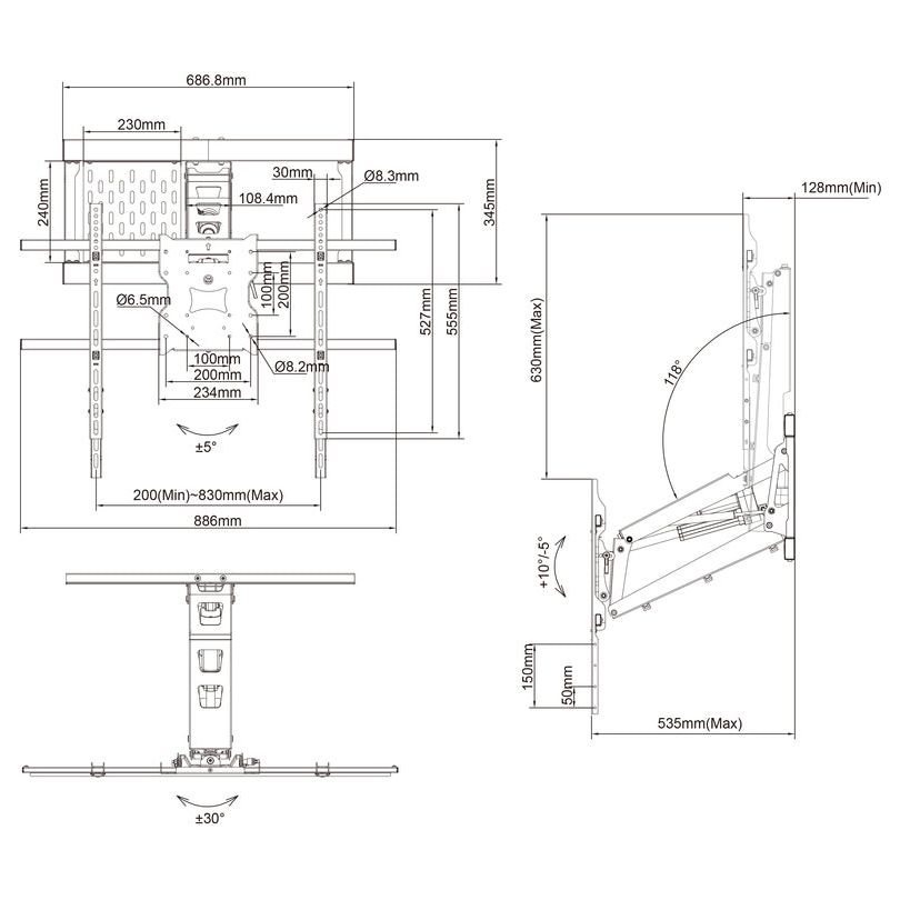 With this mount your TV can be lowered 630mm in position from its highest position to its lowest position. So you can already now try that at home, showing where your TV would be when using the M Motorized Pull Down Full Motion Flexarm 42"-80".