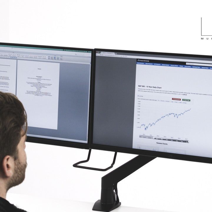 Multibrackets clean designed dual hinge bow works makes your gaslift work with two screens up to 28" monitors. A handle for simple dual positioning of your screens is mounted on the bottom part of the bow._x000D_