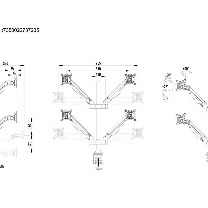 The M Vesa Gas Lift Arm Quad holds to your standard workdesk (max 50mm), or assemble it using a workdesk thru hole technique.